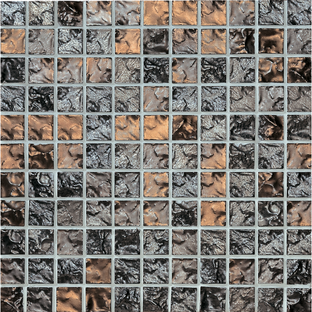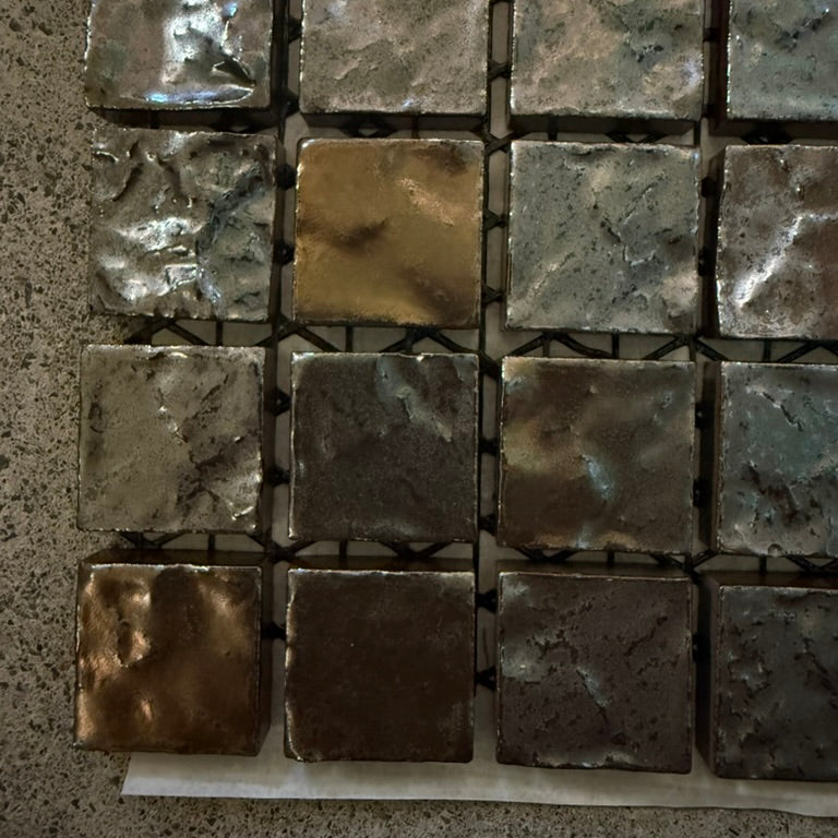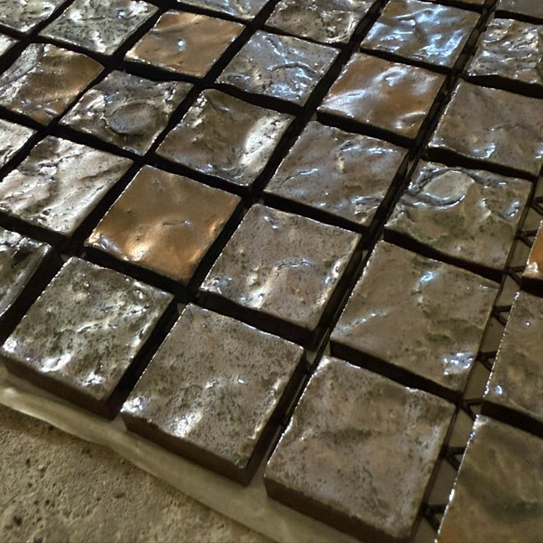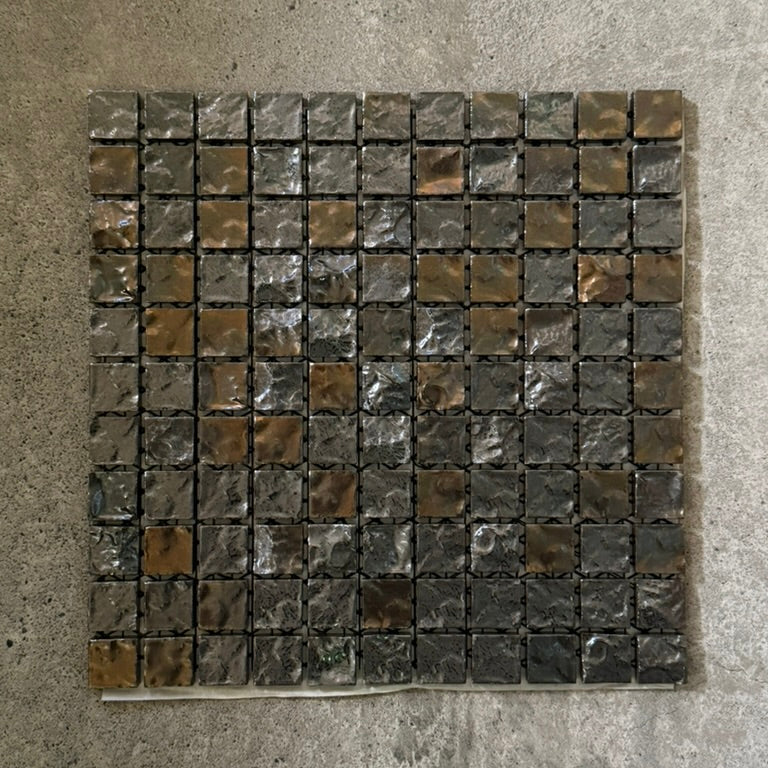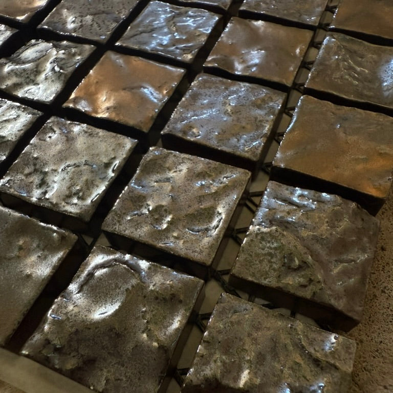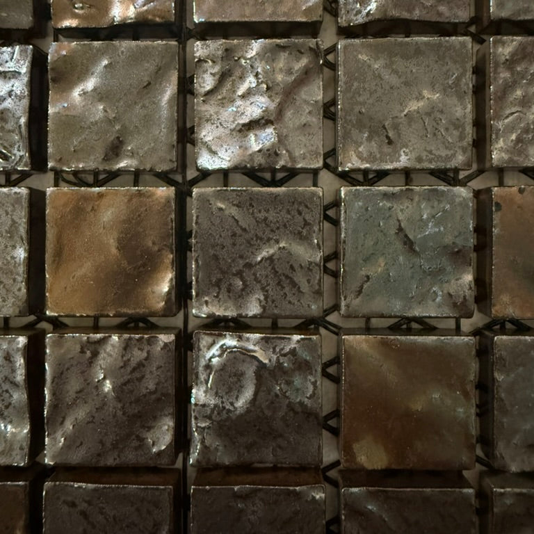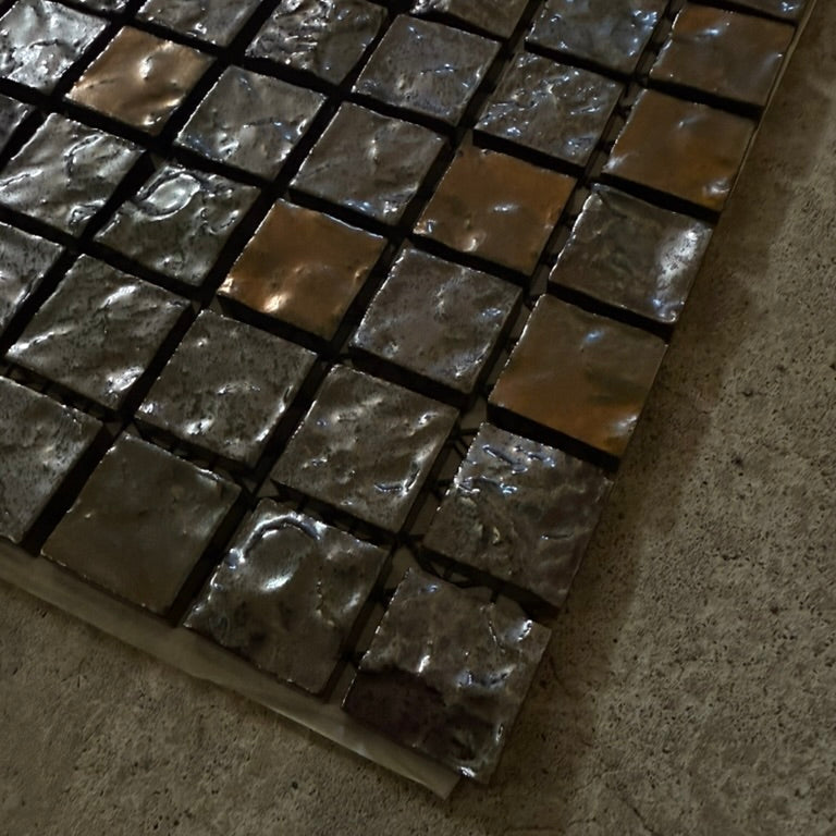 25mm角の小さなモザイクタイルに、面の凹凸と釉薬の揺らぎが重なり、光の当たり方で印象が変わります。