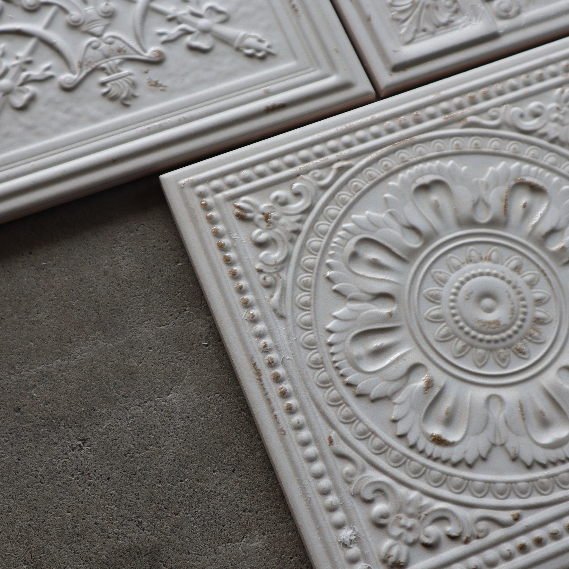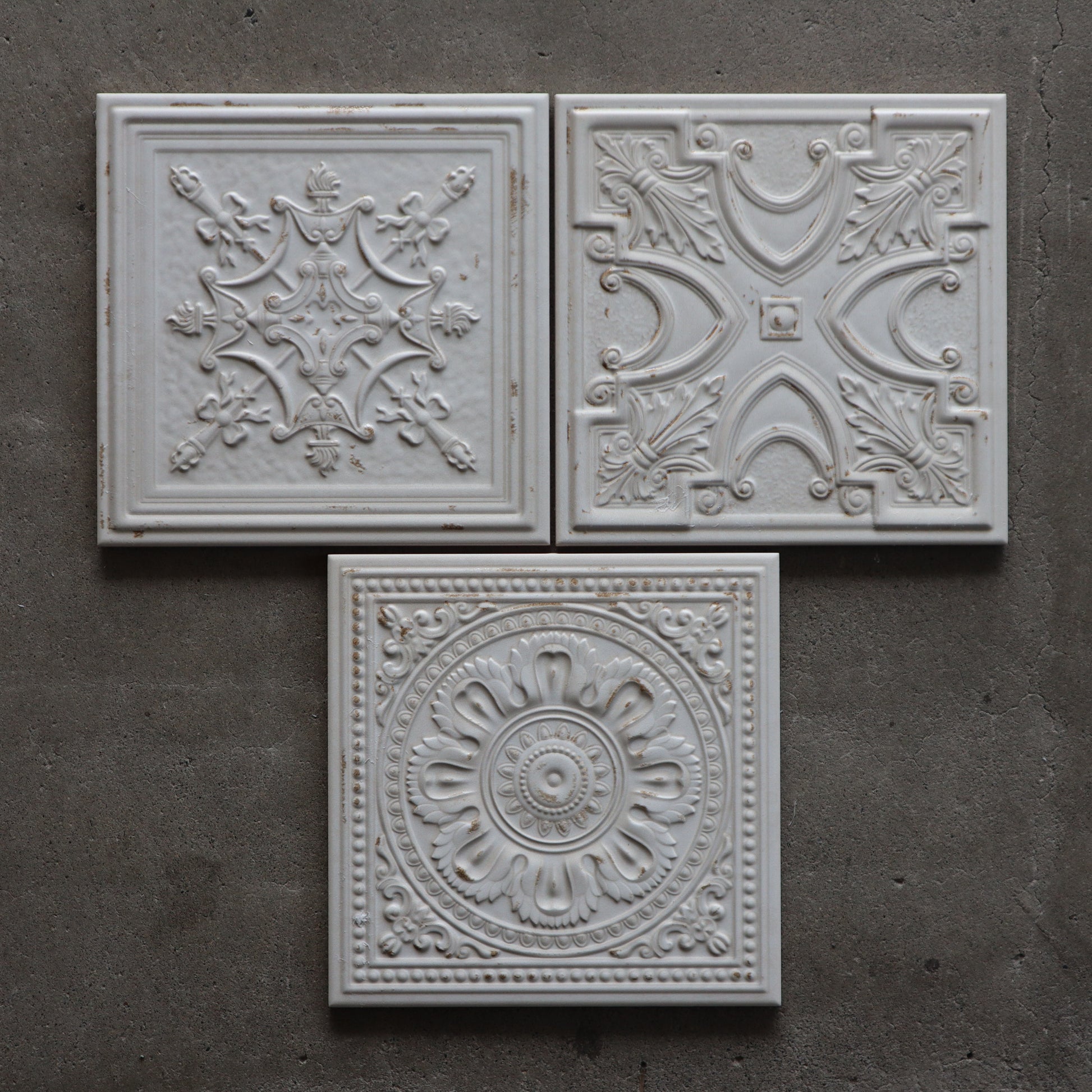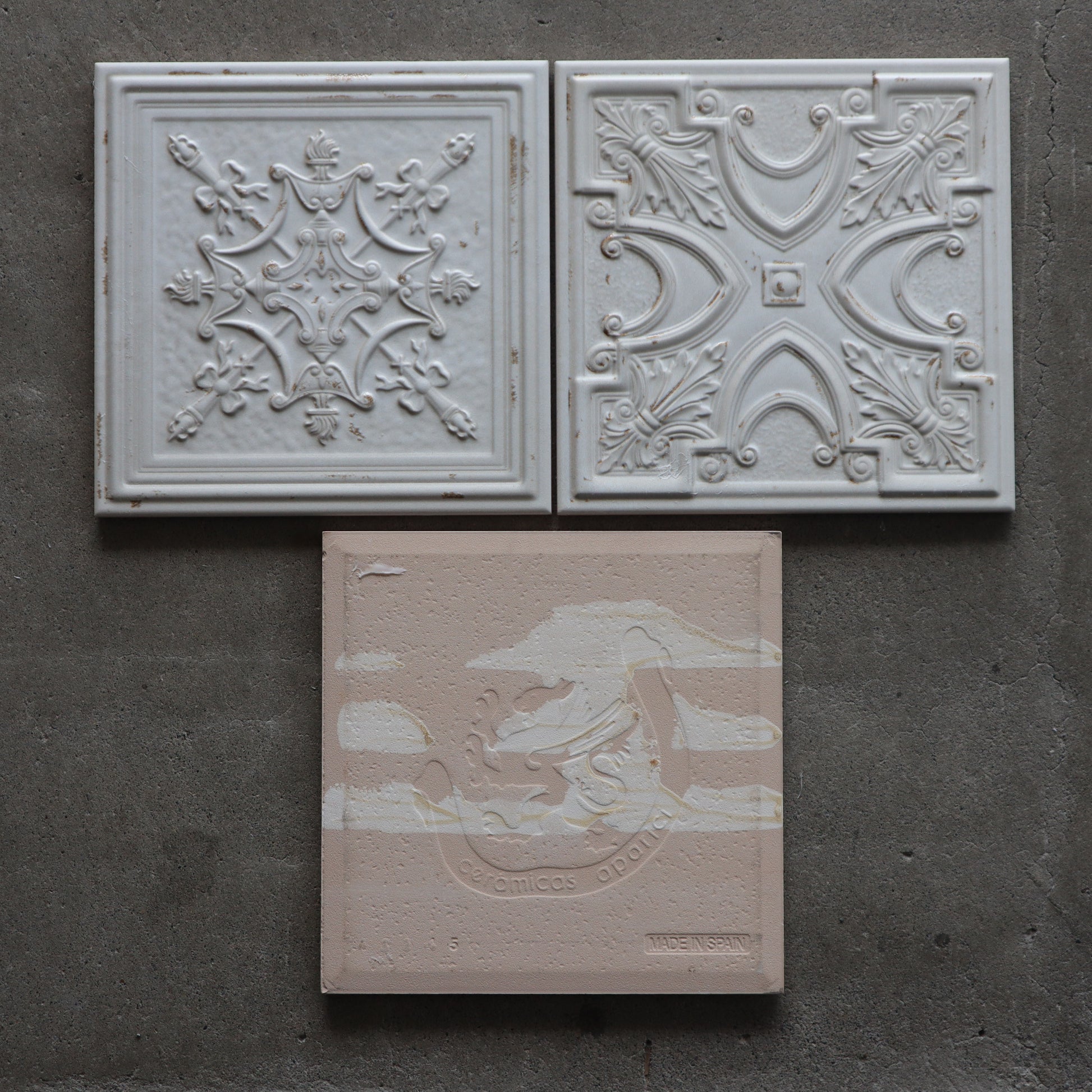 ■ 残っている柄(3種類) シリーズ特有の繊細な凹凸模様が印象的で、それぞれがアンティークタイルの意匠を思わせる佇まいを持っています。